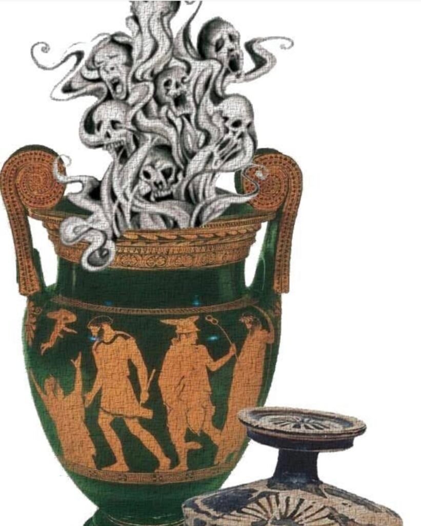 Nel mito greco il “vaso” regalato a Pandora da Zeus, infuriato contro Prometeo, il titano che aveva rubato il fuoco agli dei per donarlo agli uomini, era in realtà una giara, pithos, grande contenitore di terracotta, alta circa due metri, utilizzata nell’antichità per conservare beni preziosi.