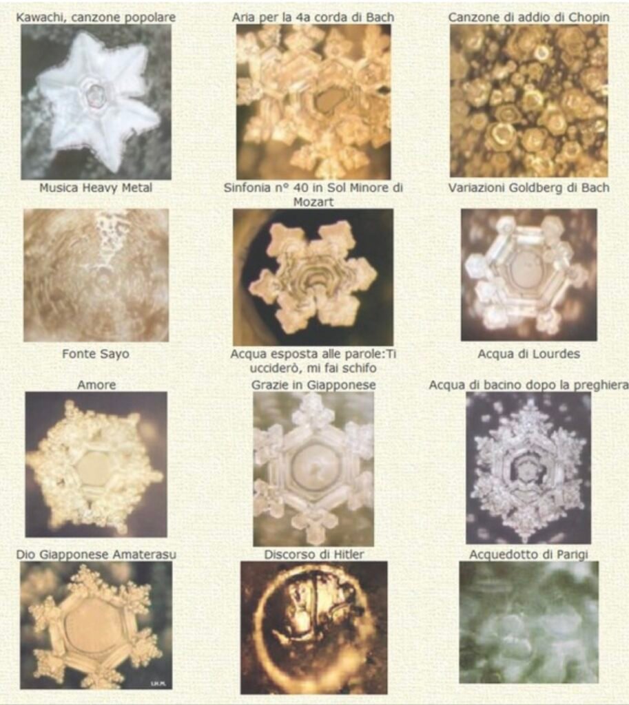 Siamo una centrale elettrochimica ed il nostro organismo è composto da Ossigeno, Carbonio, Idrogeno, Azoto e dal 60% del peso corporeo di acqua che è presente dentro di noi in uno stato definito “quarto stato” che permette lo scorrere di fluidi intelligenti organizzati spazialmente. L’acqua ha una sua memoria così come ci ha proposto Jacques Benveniste negli anni Ottanta e così come è stato sperimentato dal giapponese Masaru Emoto. L’acqua memorizzerebbe energie ed informazioni basandosi su una struttura molecolare che cambierebbe rapidamente, in risposta a stimoli esterni, reagendo anche a vibrazioni come parole, musica, intenzioni e sentimenti.