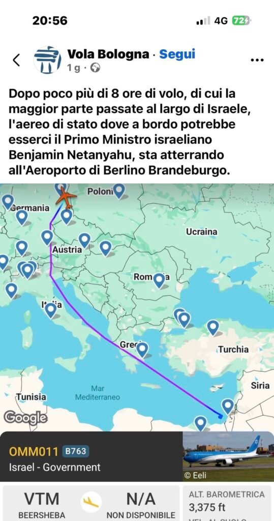 Vi informo che il criminale, responsabile del genocidio di Gaza e di altri crimini, tra cui l’aver favorito Jeffrey Epstein, è fuggito a Berlino con un Boeing 767 del governo israeliano (nominativo OMMO011), partito da Beersheba, Israele, ed atterrato a Berlino, Germania, alle 3:31 di sabato 28 febbraio.