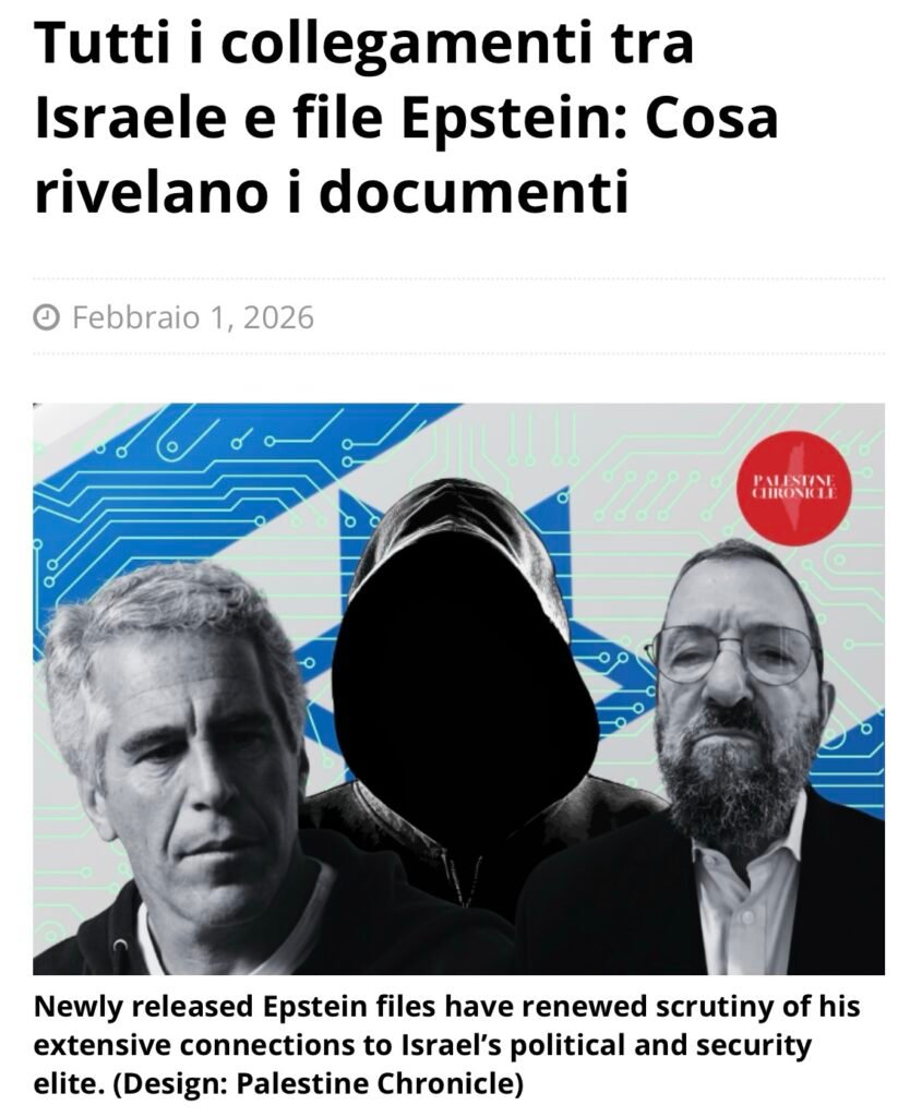 Sappiamo che i collegamenti tra lo Stato di Israele e il criminale Jeffrey Epstein sono oramai evidenti, così come appare da un articolo, datato 1 febbraio 2026 della Redazione Palestine Chronicle.