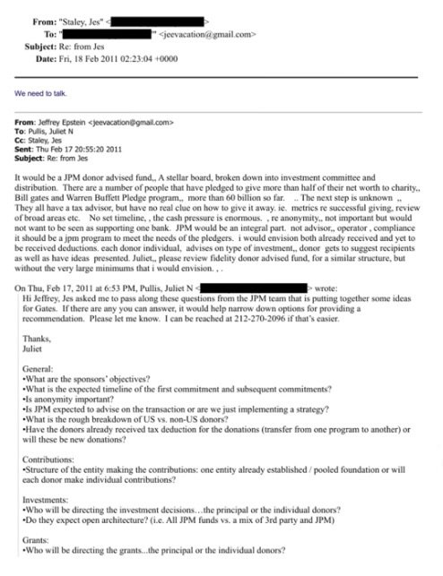 Ora sappiamo anche che la pandemia, con i relativi vaccini, è stata progettata a tavolino, come “business”, dalla triangolazione J.P.Morgan, la famosa banca, Bill Gates ed Epstein, così come si può evincere dal documento, qui sotto inserito, di una mail del 18.02.2011. Si è creato un business legato ai fondi da donatori, usati come finta beneficienza ed esenti da tassazione. Lo stesso metodo usato per creare l’Ospedale Fiera a Milano creato nel 2020 per l’emergenza Covid per una spesa totale di 21 milioni di euro provenienti da donazione privata (di cui 10 messi a disposizione da Silvio Berlusconi e altrettanti da Leonardo Del Vecchio, l’allora patron di Luxottica).